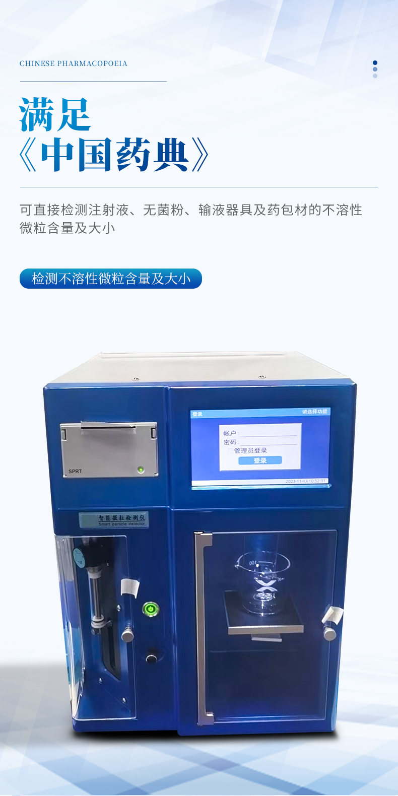 l滿足《中國藥典》可直接檢測注射液、無菌粉、麻醉包、輸液器具及一次性血路等產品的微粒含量及大小,符合GB8368-1998,、GB31935-2003、6B368-205及GB83568-2018的檢測標準