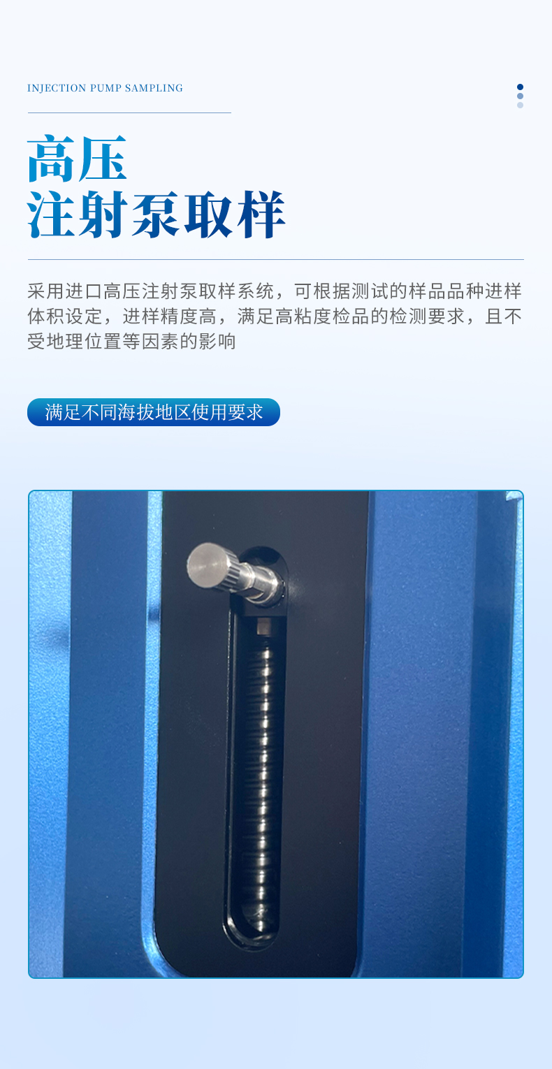 l采用進口高壓注射泵取樣系統,可根據測試的樣品品種進樣體積設定,進樣精度高,滿足高粘度檢品的檢測要求,且不受地理位置等因素的影響,滿足不同海拔地區的使用要求。