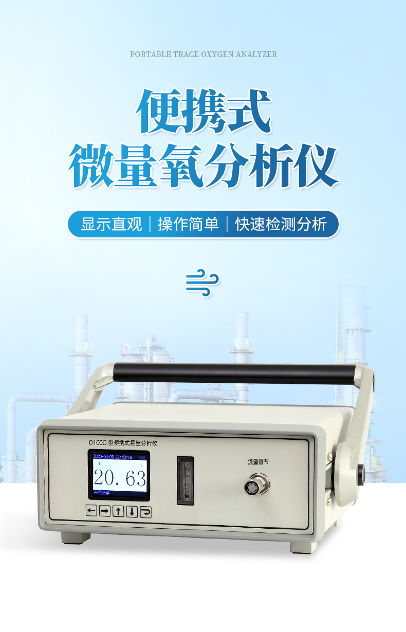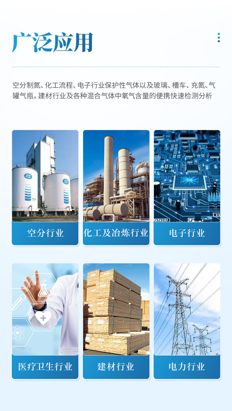 空分制氮、化工流程、電子行業保護性氣體以及玻璃、槽車、充氮、氣罐氣瓶,建材行業及各種混合氣體中氧氣含量的便攜快速檢測分析