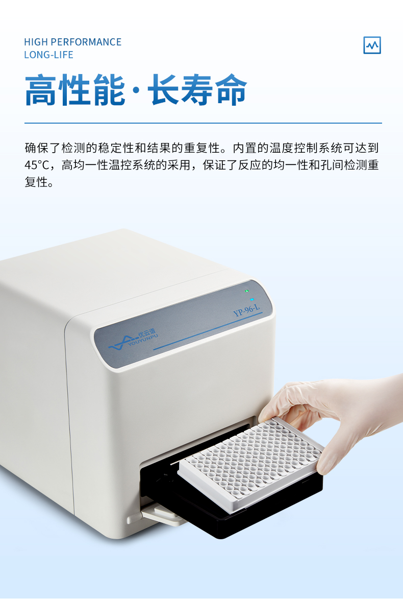 | 高性能,長壽命單色LED及激光LED的應用,確保了檢測的穩定性和結果的重復性。內置的溫度控制系統可達到45°C,高均一性溫控系統的采用,保證了反應的均一性和孔間檢測重復性 | ![]() |