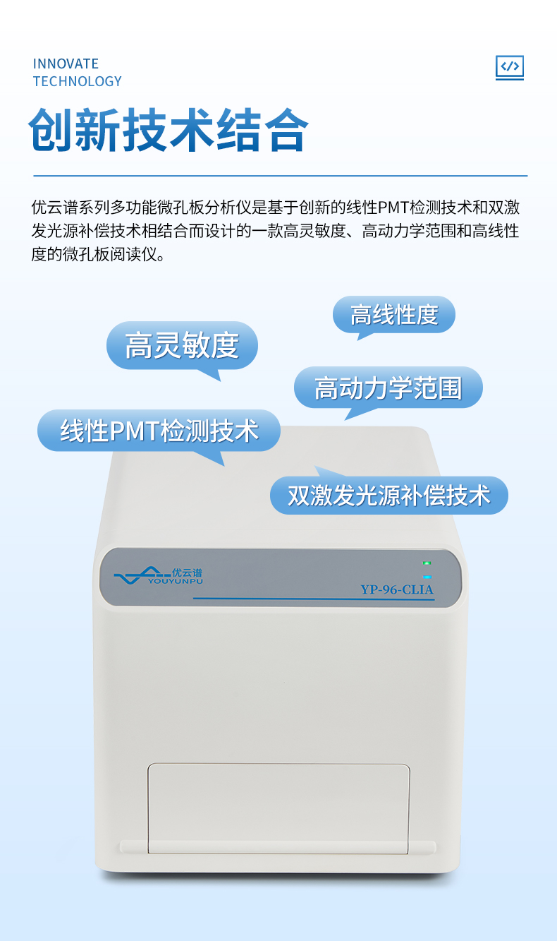 優云譜系列多功能微孔板分析儀是基于創新的線性PMT檢測技術和雙激發光源補償技術相結合而設計的一款高靈敏度、高動力學范圍和高線性度的微孔板閱讀儀。根據不同配置,可以實現化學發光(CLIA)、光激化學發光(LiCA)和時間分辨熒光(TRF)三種檢測模式。可靈活配置1到3種檢測模式,為研究人員提供一種靈活的解決方案。