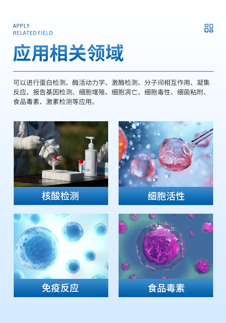 儀器廣泛應用于核酸、免疫、細胞分析領域的相關研究,可以進行蛋白檢測、酶活動力學、激酶檢測、分子間相互作用、凝集反應、報告基因檢測、細胞增殖、細胞凋亡、細胞毒性、細菌粘附、食品毒素及激素檢測等應用。