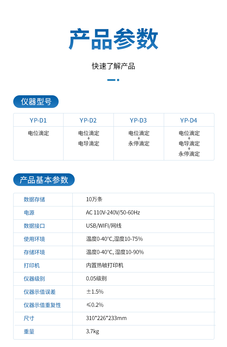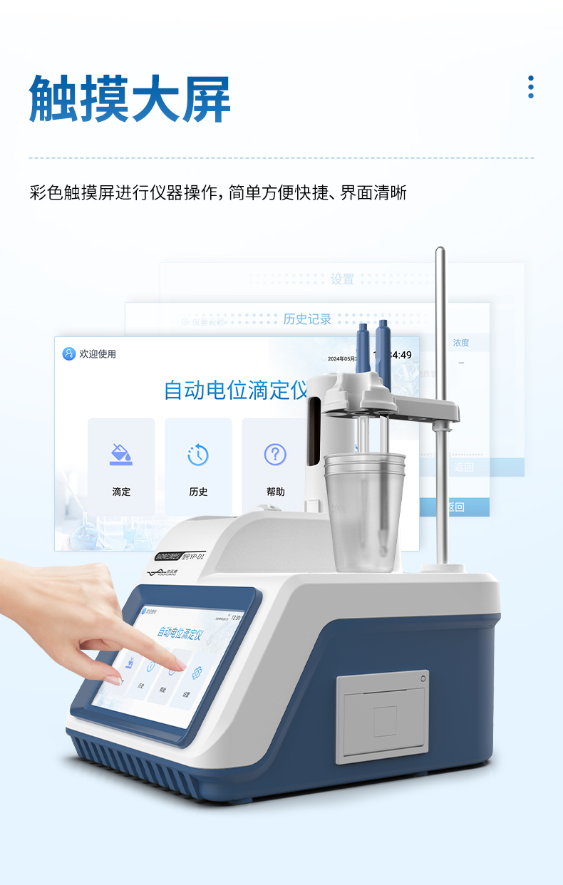 自動電位滴定儀是一種用于化學分析的精密儀器,他通過自動添加滴定劑來確定樣品中特定成分的濃度。該儀器基于電位滴定原理工作,即根據在滴定過程中電池電動勢的變化來確定滴定終點的一款滴定設備。設備滿足國家檢定規程JJG 814-2015《自動電位滴定儀》儀器級別中的0.05級別,即儀器最大示值誤差為±1.5%,儀器示值重復性≤0.2%