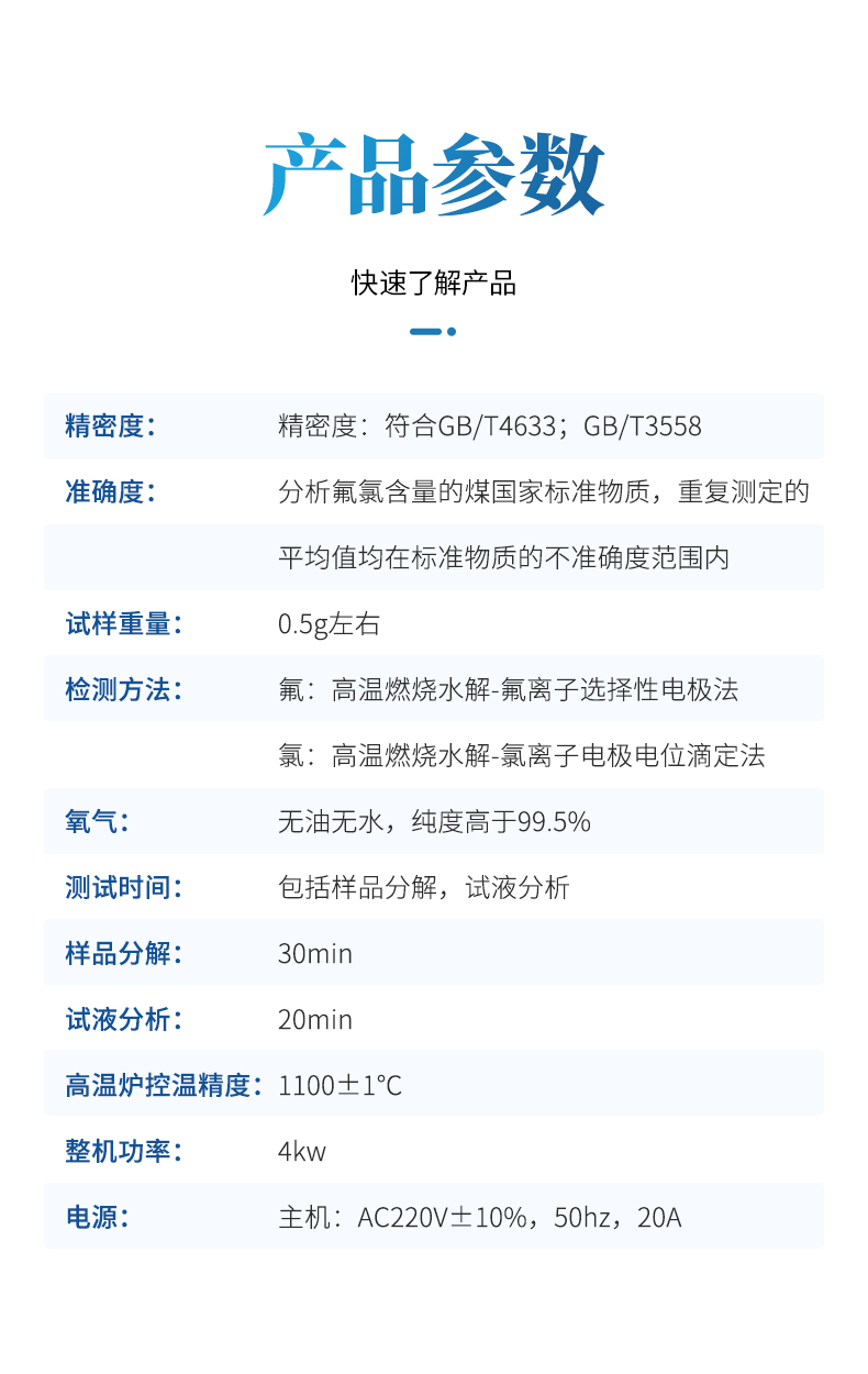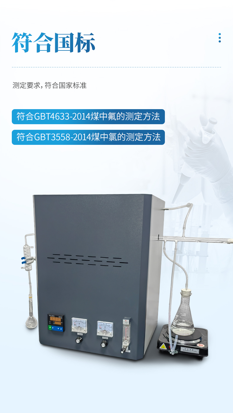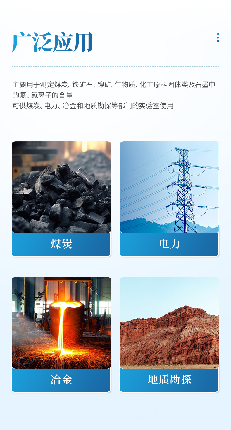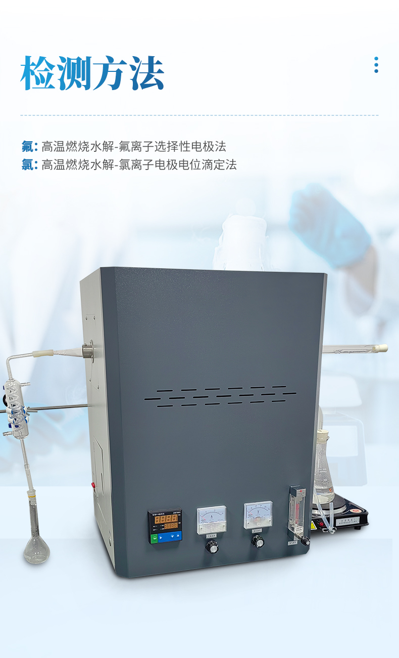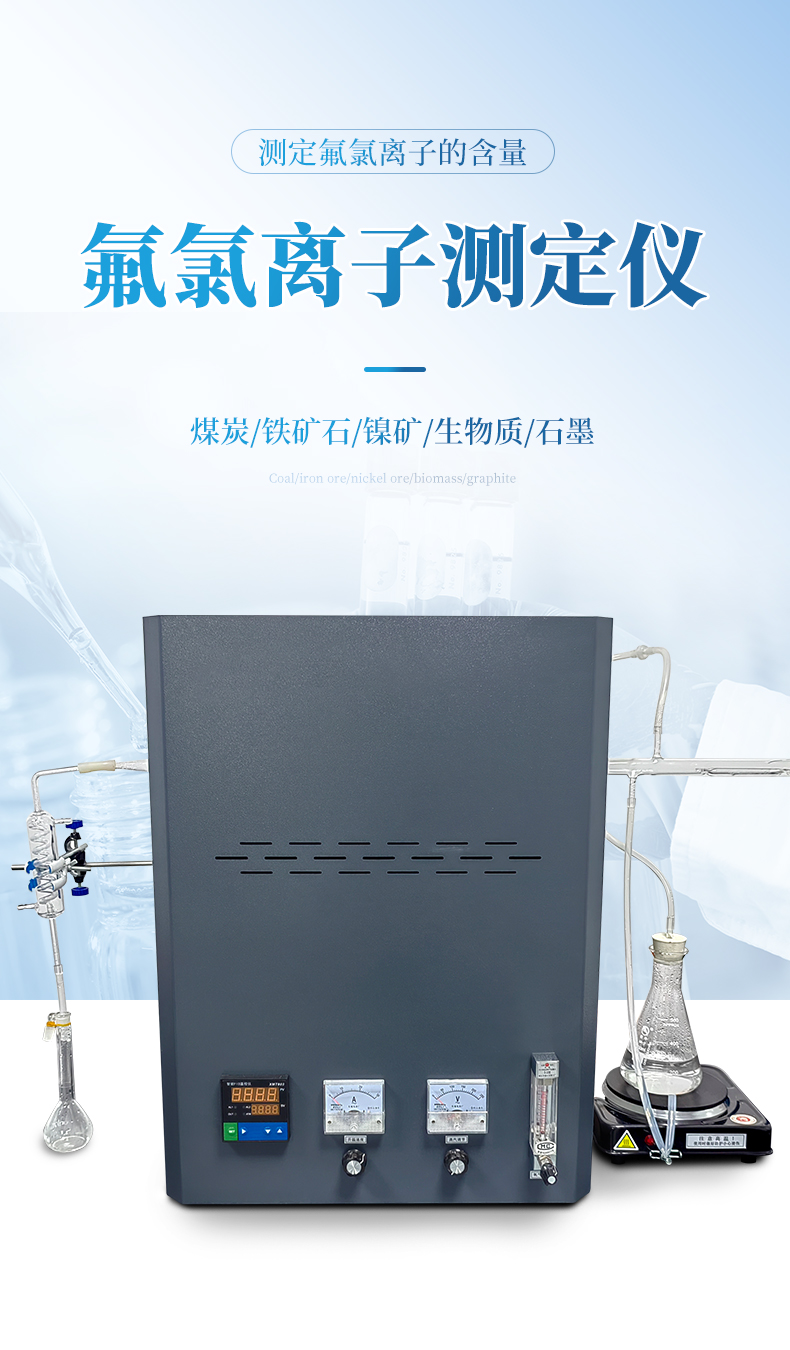 氟氯離子測定儀(高溫燃燒水解裝置、氟氯離子計(jì)、氟氯電極)主要用于測定煤炭、鐵礦石、鎳礦、生物質(zhì)、化工原料固體類及石墨中的氟、氯離子的含量,符合GBT4633-2014煤中氟的測定方法、GBT3558-2014煤中氯的測定方法國家標(biāo)準(zhǔn)要求。檢測原理:利用高溫燃燒水解—氟/氯離子選擇性電極法測定煤中總氟、氯含量。可供煤炭、電力、冶金和地質(zhì)勘探等部門的實(shí)驗(yàn)室使用。
