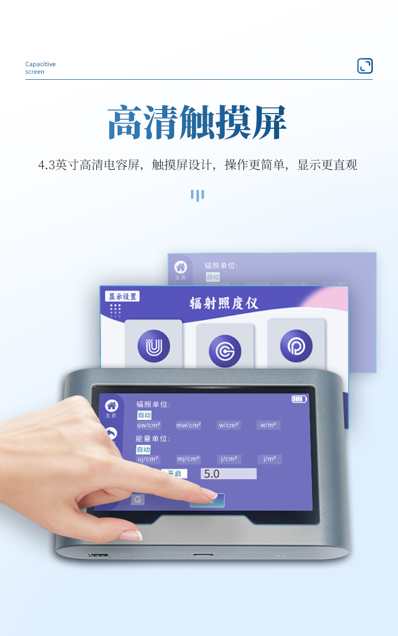 觸摸屏輻射照度計采用高清全觸摸屏設計,操作更簡單;即使是弱光也能快速讀