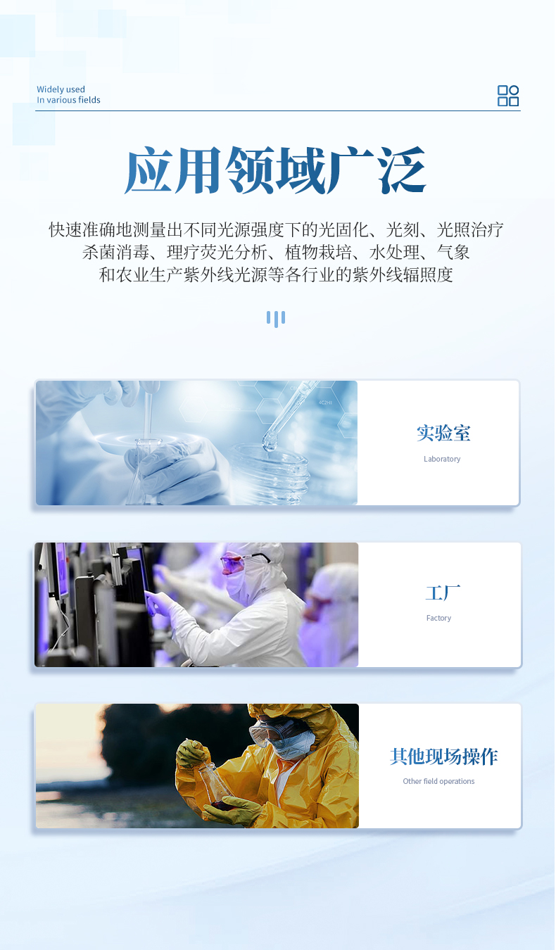 取,精度更高;量程可自動識別切換,真正實現從弱光到強光一機式測試,儀器操作更加簡單快捷??焖佟蚀_地測量出不同光源強度下的光固化、光刻、光照治療、殺菌消毒、理療熒光分析、植物栽培、水處理、氣象和農業生產紫外線光源等各行業的紫外線輻照度。