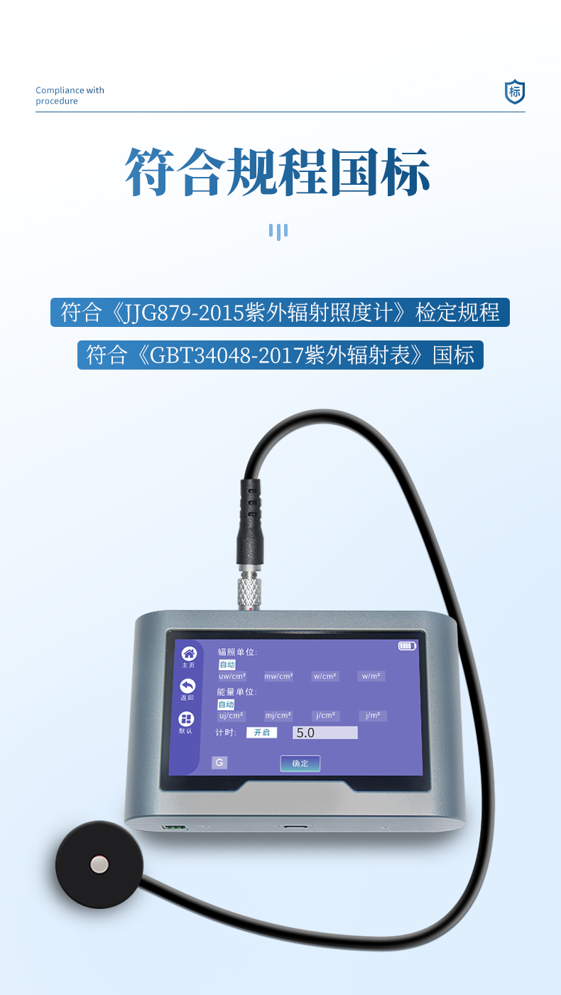 7.符合規程:《JJG879-2015紫外輻射照度計》檢定規程、《GBT34048-2017紫外輻射表》國標;