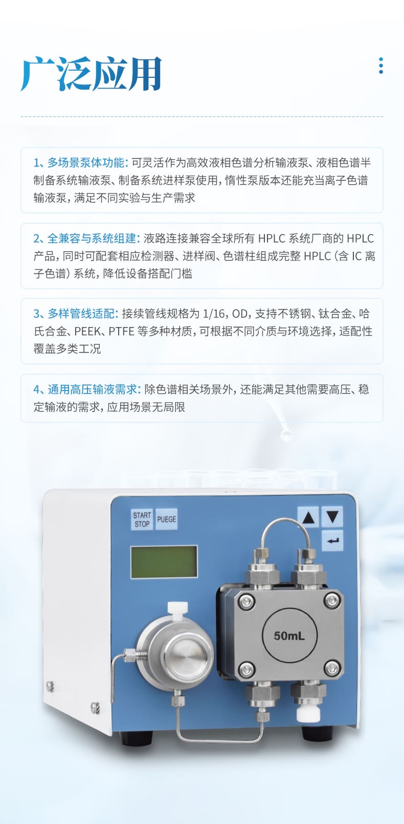 6.可配套相應的梱測器、進樣閥、色譜柱組成 HPLC(包括 IC 離子色譜)系統
