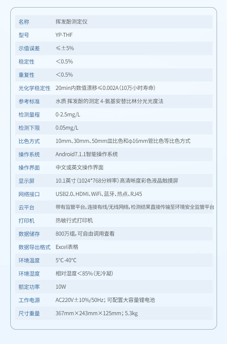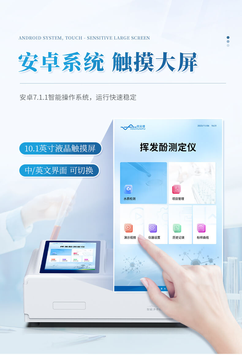 本儀器主要檢測水質(zhì)揮發(fā)性酚含量指標(biāo),兼具智能數(shù)據(jù)分析功能,圖表、列表顯示數(shù)據(jù),分析一目了然;高清晰度彩色液晶觸摸顯示屏,Android智能操作系統(tǒng),中文顯示界面,中英文鍵盤,人性化操作,使用更簡單。