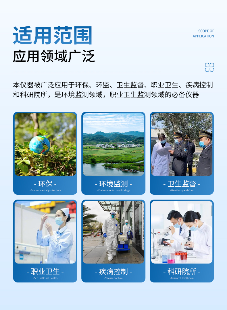 本儀器被廣泛應用于環保、環監、衛生監督、職業衛生、疾病控制和科研院所。
