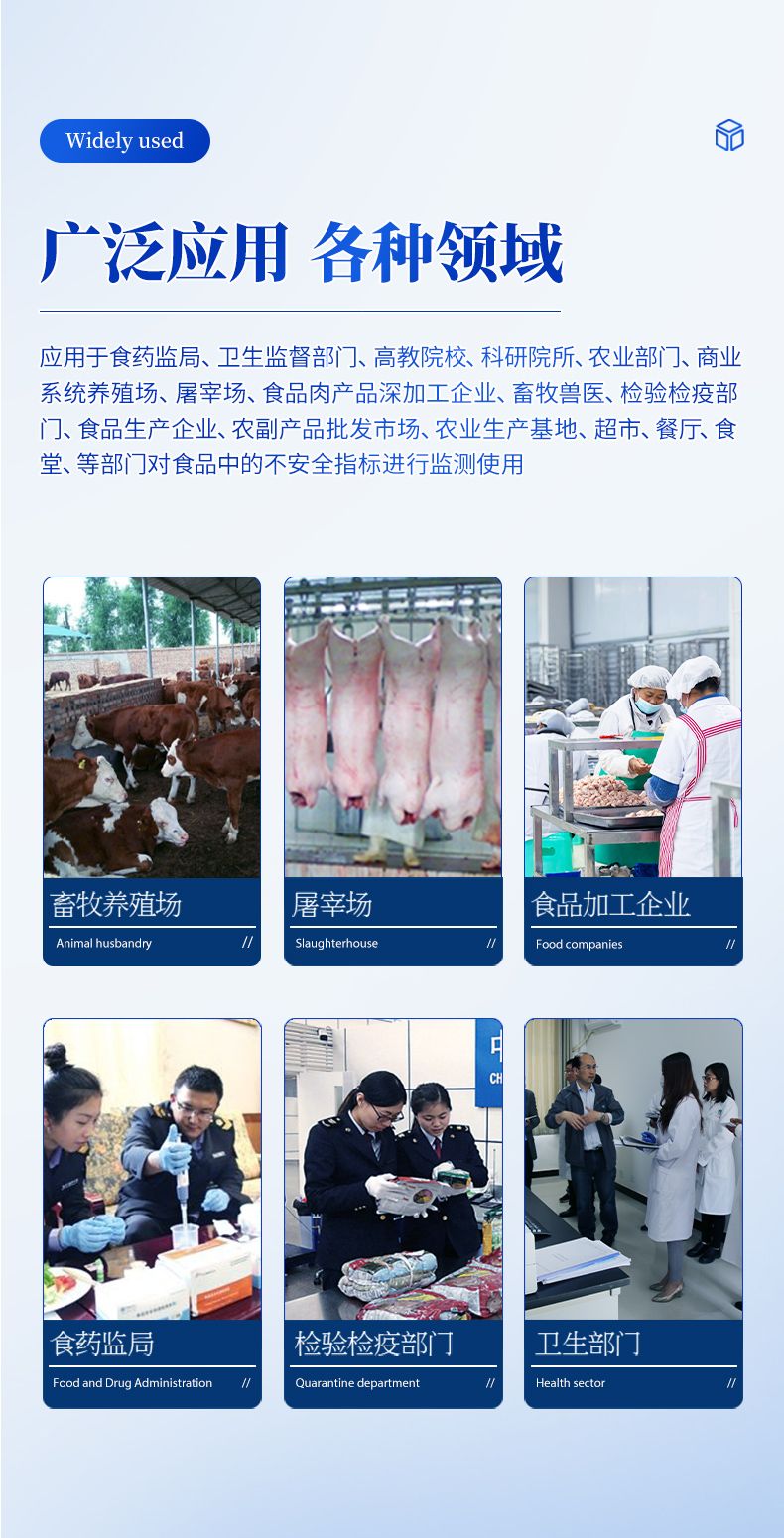 該儀器廣泛應用于食藥監局、衛生監督部門、高教院校、科研院所、農業部門、商業系統養殖場、屠宰場、食品肉產品深加工企業、畜牧獸醫、檢驗檢疫部門、食品生產企業、農副產品批發市場、農業生產基地、超市、餐廳、食堂、等單位部門對食品中的不安全指標進行監測使用。
