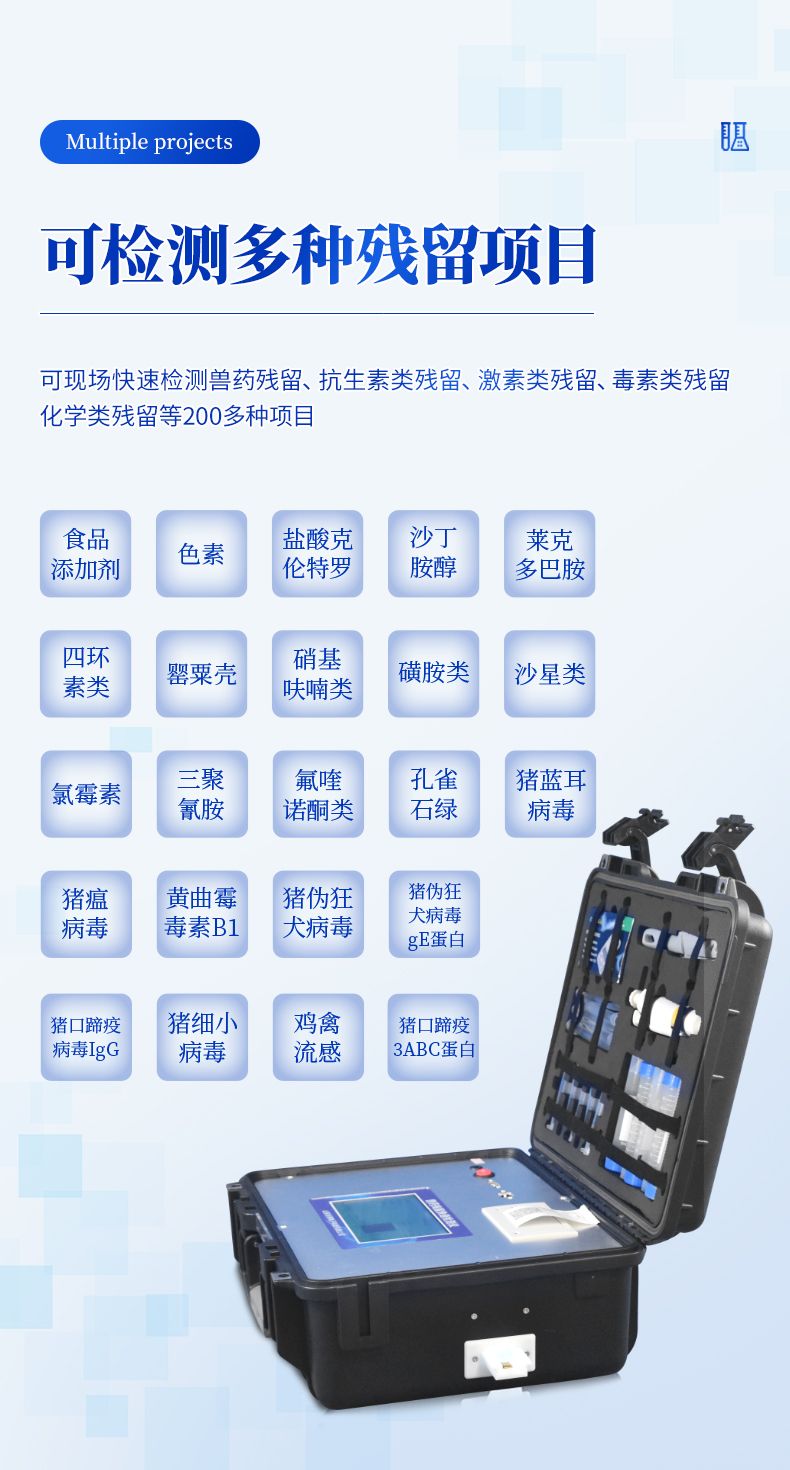 動物疫病類:豬藍耳病毒、豬瘟病毒、豬偽狂犬病毒、豬偽狂犬病毒gE蛋白、豬口蹄疫3ABC蛋白、豬口蹄疫病毒IgG、豬細小病毒、雞禽流感等