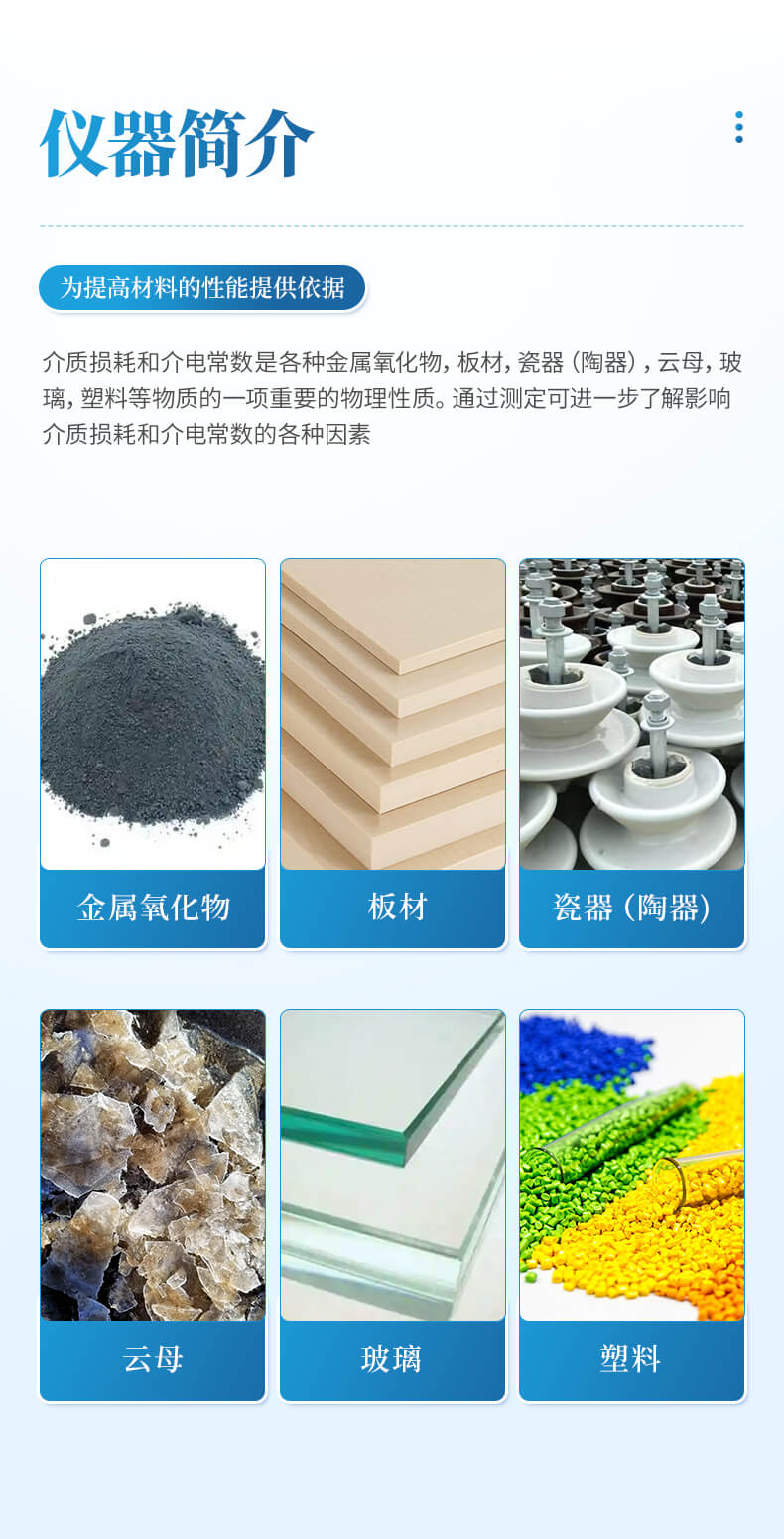介質(zhì)損耗和介電常數(shù)是各種金屬氧化物,板材,瓷器(陶器),云母,玻璃,塑料等物質(zhì)的一項重要的物理性質(zhì)。通過測定可進一步了解影響介質(zhì)損耗和介電常數(shù)的各種因素,為提高材料的性能提供依據(jù)。