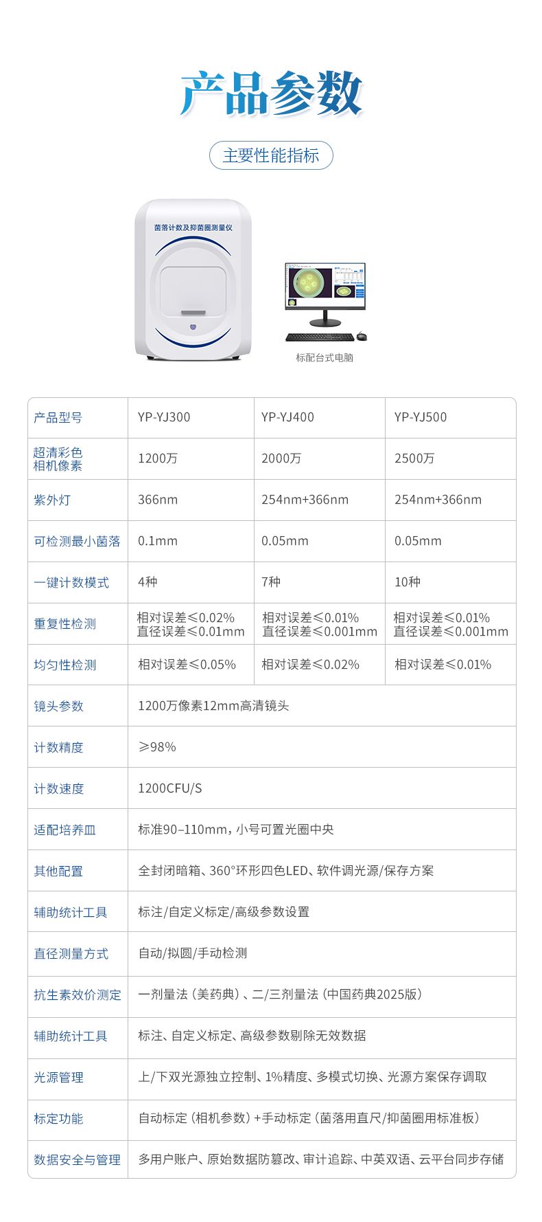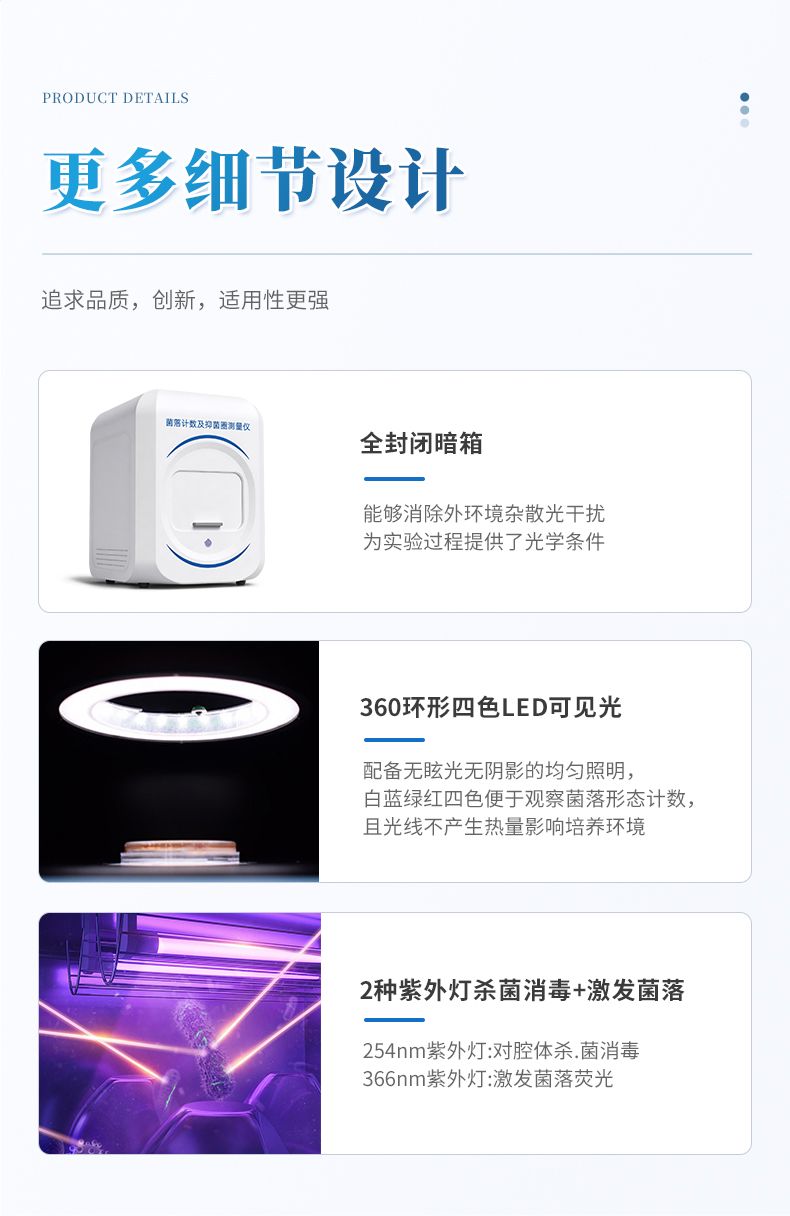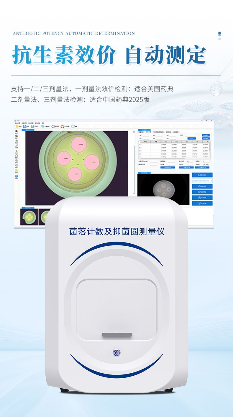 本產品是一款集圖像采集、數據處理與統計分析于一體的全自動菌落計數及抑菌圈測量儀,廣泛應用于食品、藥品、化妝品、環境監測、醫療衛生、科研院校等領域。儀器采用先進的數字圖像處理技術,具備熒光菌識別、抑菌圈測量及效價測定和殺菌功能,可快速精準完成培養皿內菌落的測量分析、抑菌圈測量及抗生素效價測定,大幅提升實驗效率,有效降低人工操作誤差。