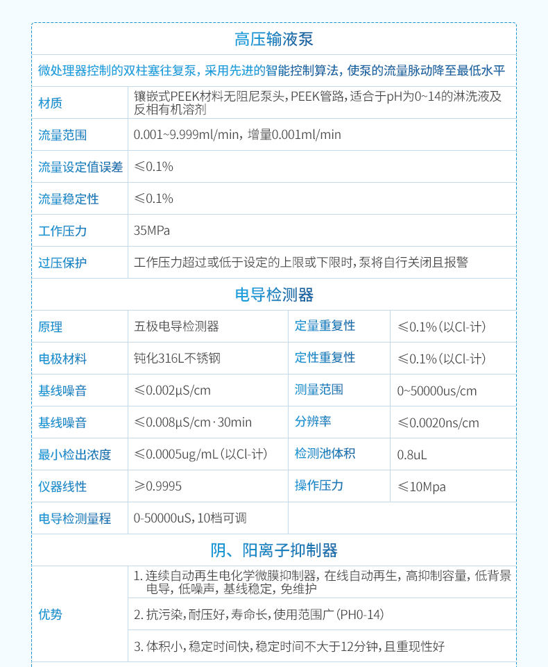 3.1連續(xù)自動再生電化學微膜抑制器,在線自動再生,高抑制容量,低背景電導,低噪聲,基線穩(wěn)定,免維護。