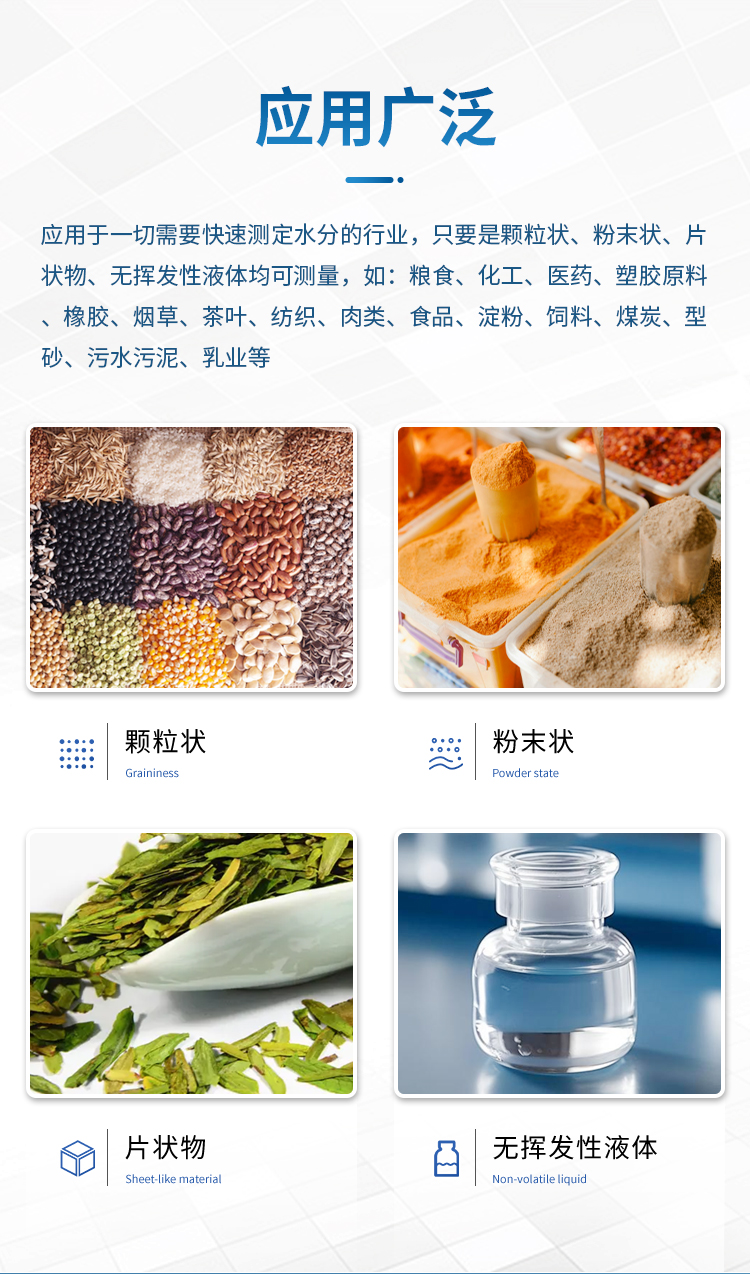 該系列快速水分測定儀應用于一切需要快速測定水分的行業,只要是顆粒狀、粉末狀、片狀物、無揮發性液體均可測量,如:糧食、化工、醫藥、塑膠原料、橡膠、煙草、茶葉、紡織、肉類、食品、淀粉、飼料、煤炭、型砂、污水污泥、乳業等等;