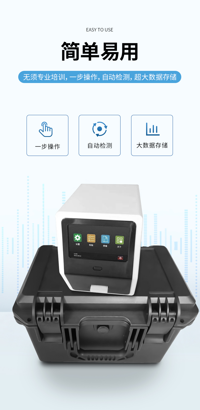 簡單易用:無須專業(yè)培訓(xùn),一步操作,自動(dòng)檢測,超大數(shù)據(jù)存儲(chǔ)。
