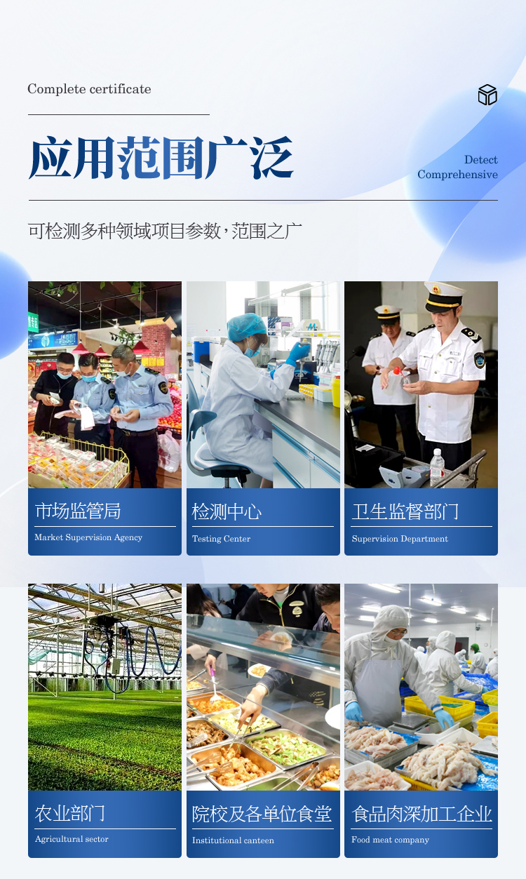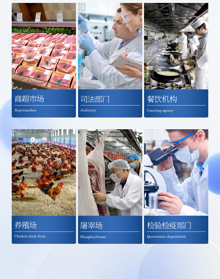該多功能食品安全檢測儀為集成化食品安全快速檢測分析設備,廣泛應用于食藥監局、衛生部門、高教院校、科研院所、農業部門、養殖場、屠宰場、食品肉產品深加工企業、檢驗檢疫部門等單位使用。