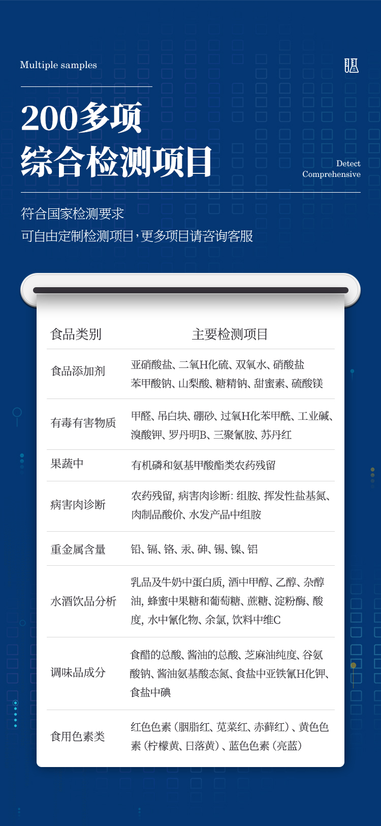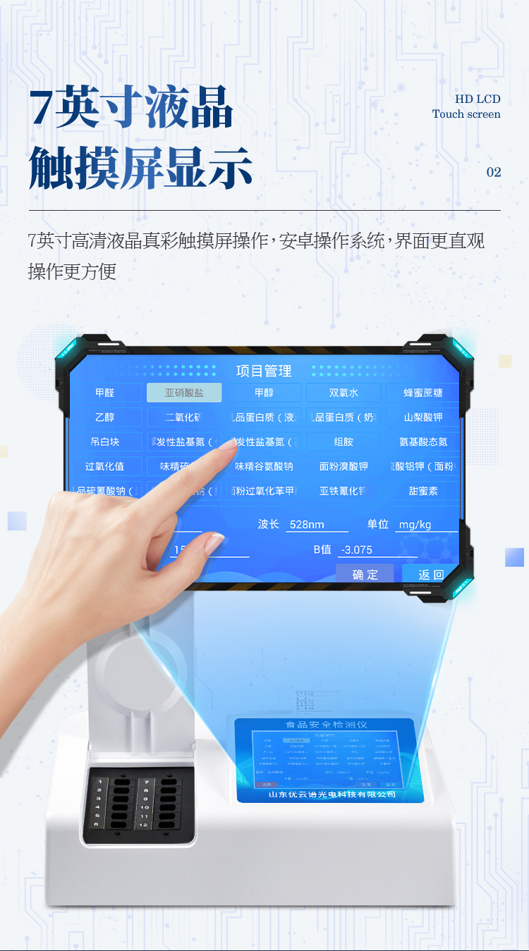 多功能食品安全檢測儀可快速檢測60多項目,包含:濫用食品添加劑、非食用化學物質、農藥殘留、重金屬含量、病害肉成分、營養強化劑、化學類殘留、食用油脂檢測、水酒飲品分析、調味品成分、食用色素等現場的定性定量檢測。
