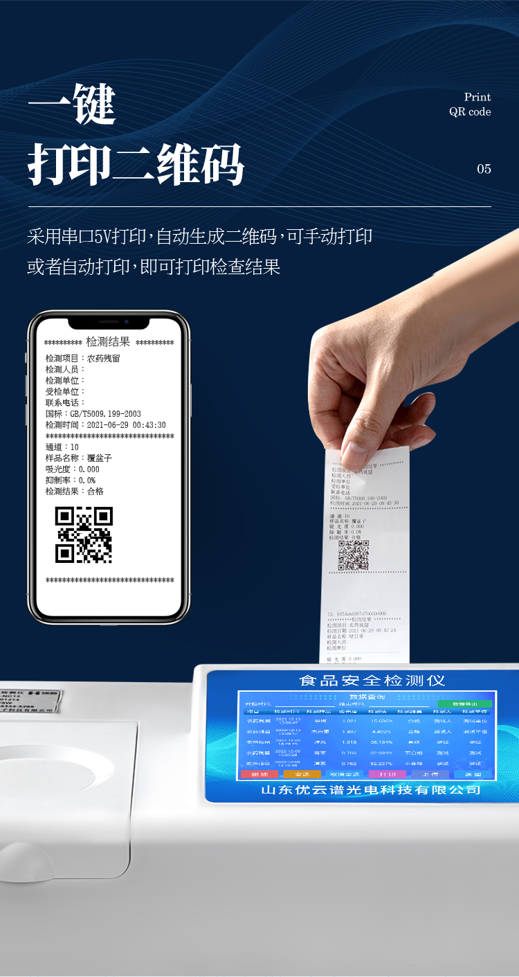 5、配備新一代嵌入式熱敏打印機,可選擇手動打印或者自動打印,檢測完成可自動打印檢測報告和二維碼。