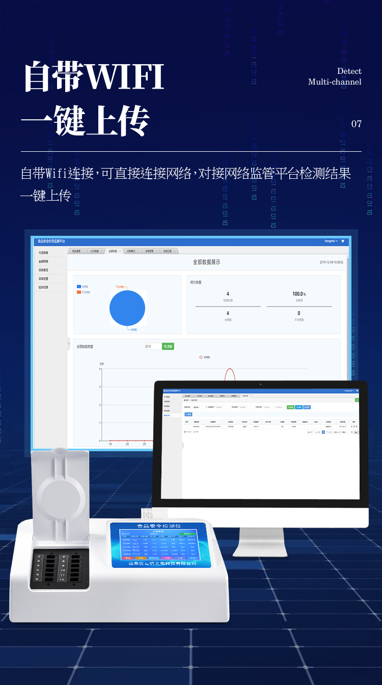 8、儀器帶有監管平臺。數據可局域網和互聯網數據上傳,檢測結果直接傳至食品安全監管平臺。進行區域食品安全監管及大數據分析處理,檢測區域食品安全長短期動態,達到食品安全問題預估、預警