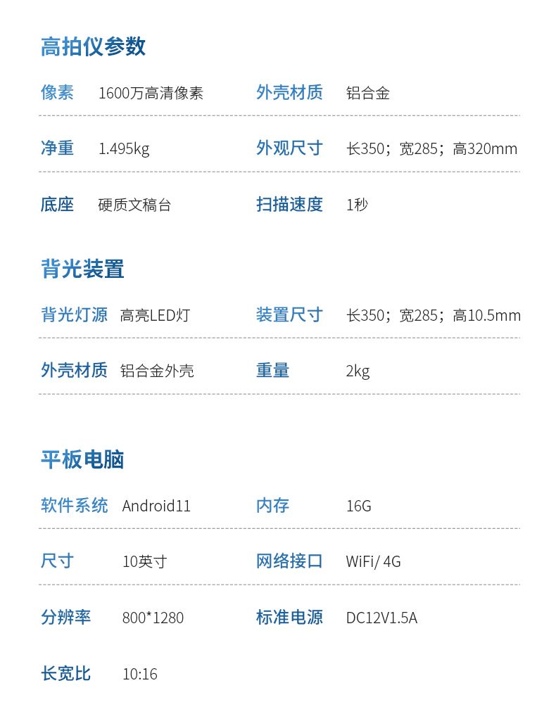 | 高拍儀 | 像素 | 1600萬高清像素 |