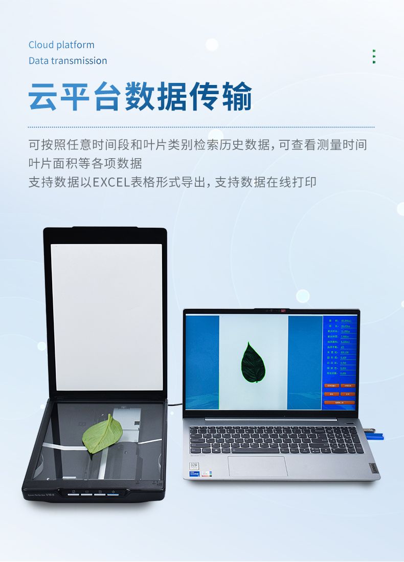 云平臺數據傳輸:數據可上傳至云平臺,可按照任意時間段和葉片類別檢索歷史數據,可查看測量時間葉片面積、周長,最大葉長、最大葉寬,圓形度,凹凸比,球狀性,形狀系數,蟲洞數量,蟲洞面積等數據,可對不同參數做柱狀圖分析,支持數據以EXCEL表格形式導出,可根據選擇的時間段展示數據、支持數據以表格、柱狀圖等分析、在線下載。