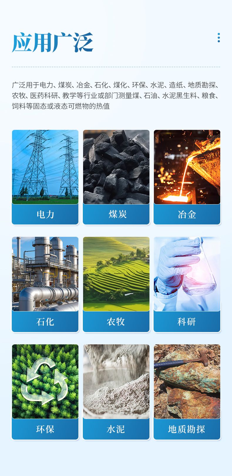 本儀器適用于電力、煤炭、冶金、石化、煤化、環(huán)保、水泥、造紙、地質勘探、農牧、醫(yī)藥科研、教學等行業(yè)或部門測量煤、石油、水泥黑生料、糧食、飼料等固態(tài)或液態(tài)可燃物的熱值。