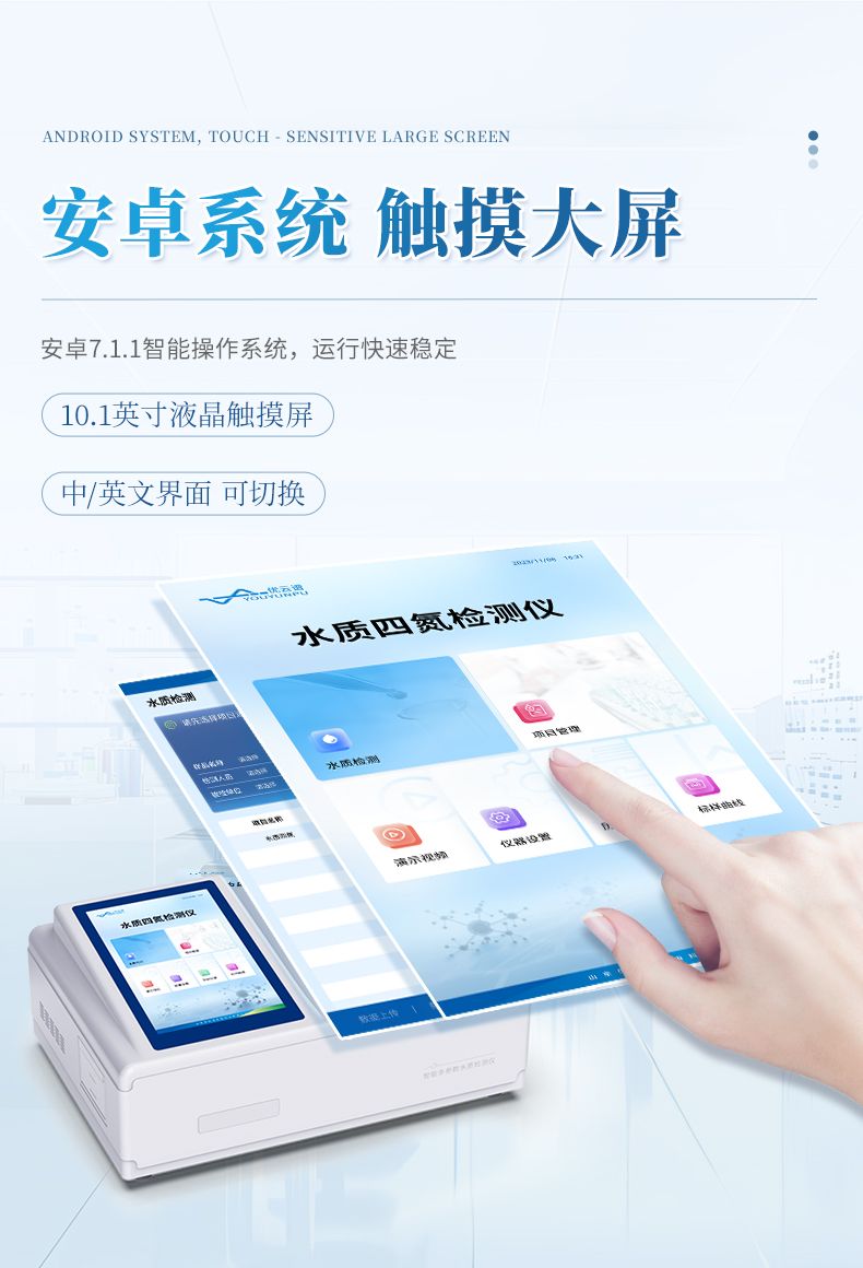 手持式水質四氮檢測儀主要檢測水體中的氨氮、硝酸鹽氮、亞硝酸鹽氮、總氮含量;參考國標以及環境標準研發設計制造,儀器配備高清晰度彩色液晶觸摸顯示屏,Android智能操作系統,中文顯示界面,中英文鍵盤,人性化操作,使用更簡單;