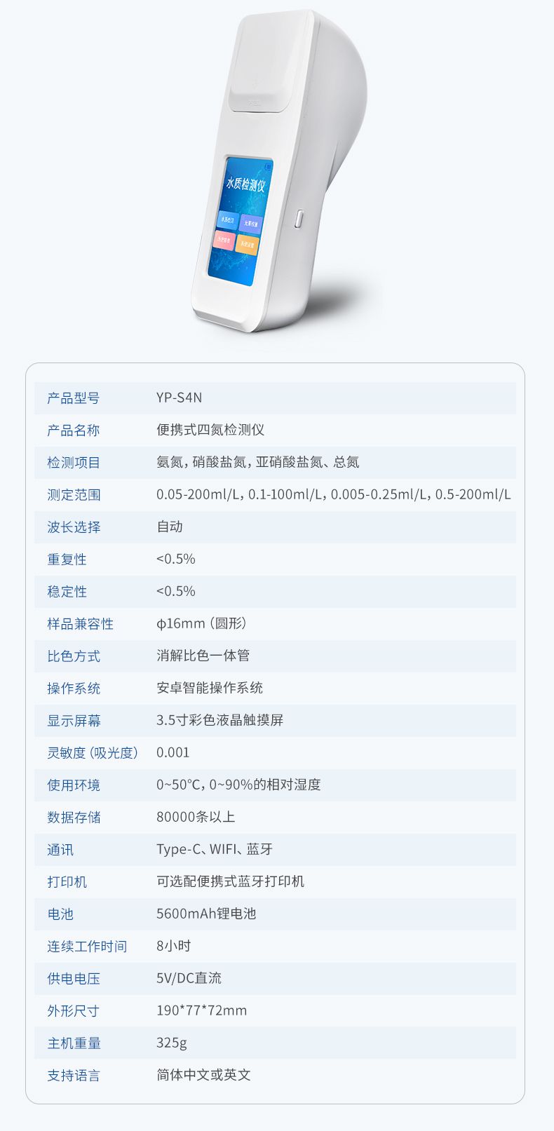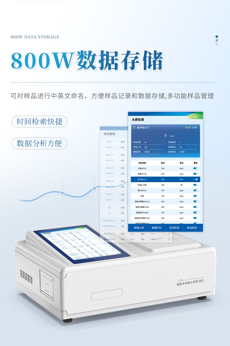 【產品簡介】快速檢測:氨氮、硝酸鹽氮、亞硝酸鹽氮、總氮;3.5英寸觸摸屏;選配藍牙打印機
