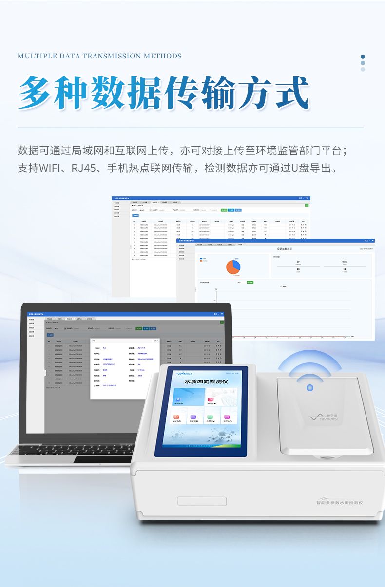 ②配置云監控平臺,檢測結果可直接無線傳至平臺,進行水質長短期分析,輔助管理。