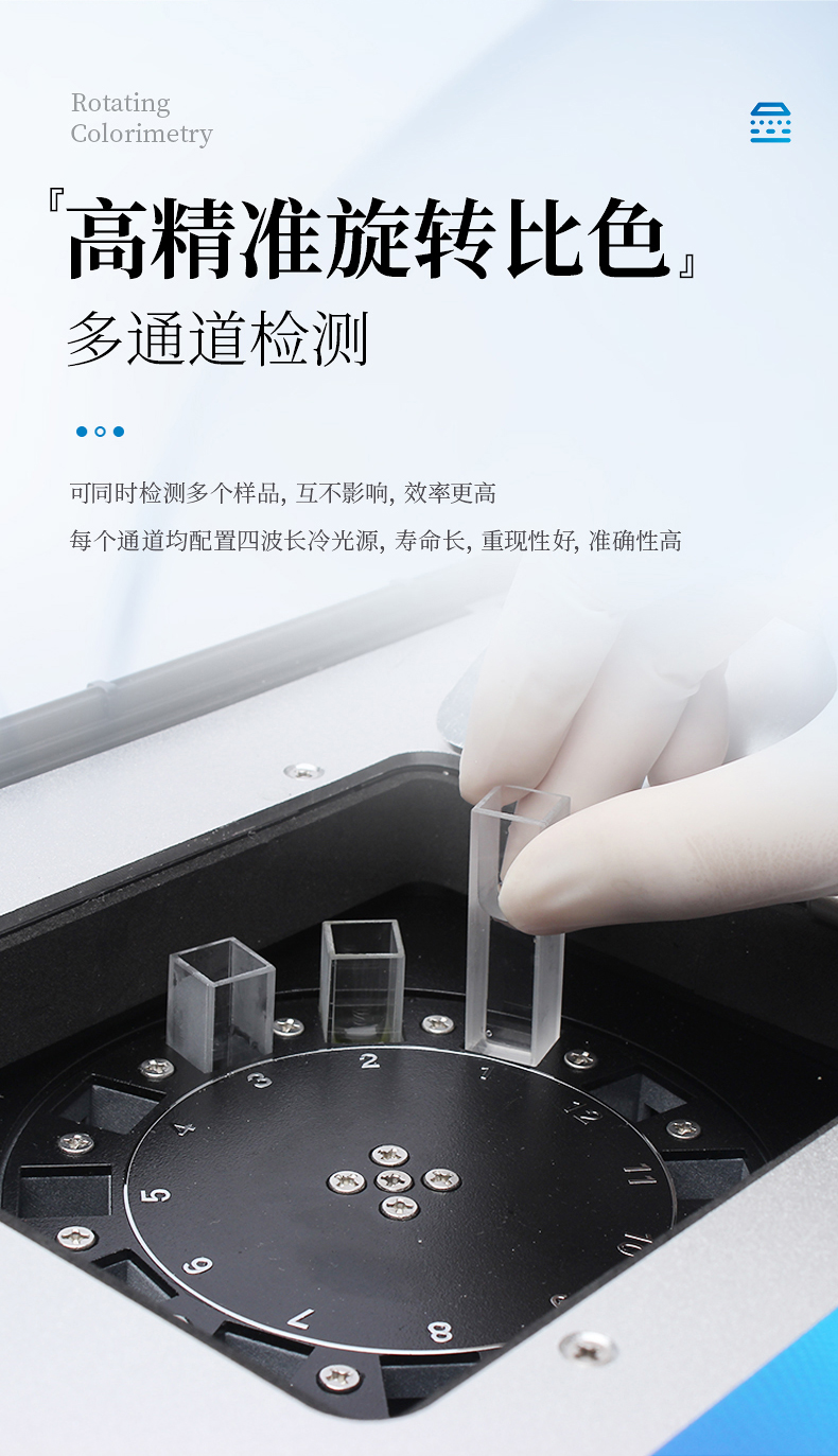 2、采用精密旋轉(zhuǎn)比色池設(shè)計(專利號:ZL 2018 2 1777724.7),光源一致性更加精確,保證檢測精度。