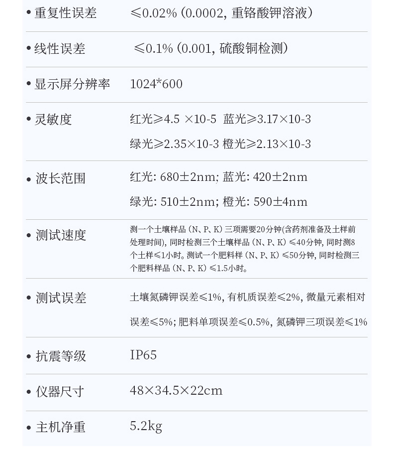 土壤氮磷鉀誤差≤1%,有機(jī)質(zhì)誤差≤2%,微量元素相對誤差≤5%;肥料單項誤差≤0.5%,氮磷鉀三項誤差≤1%。