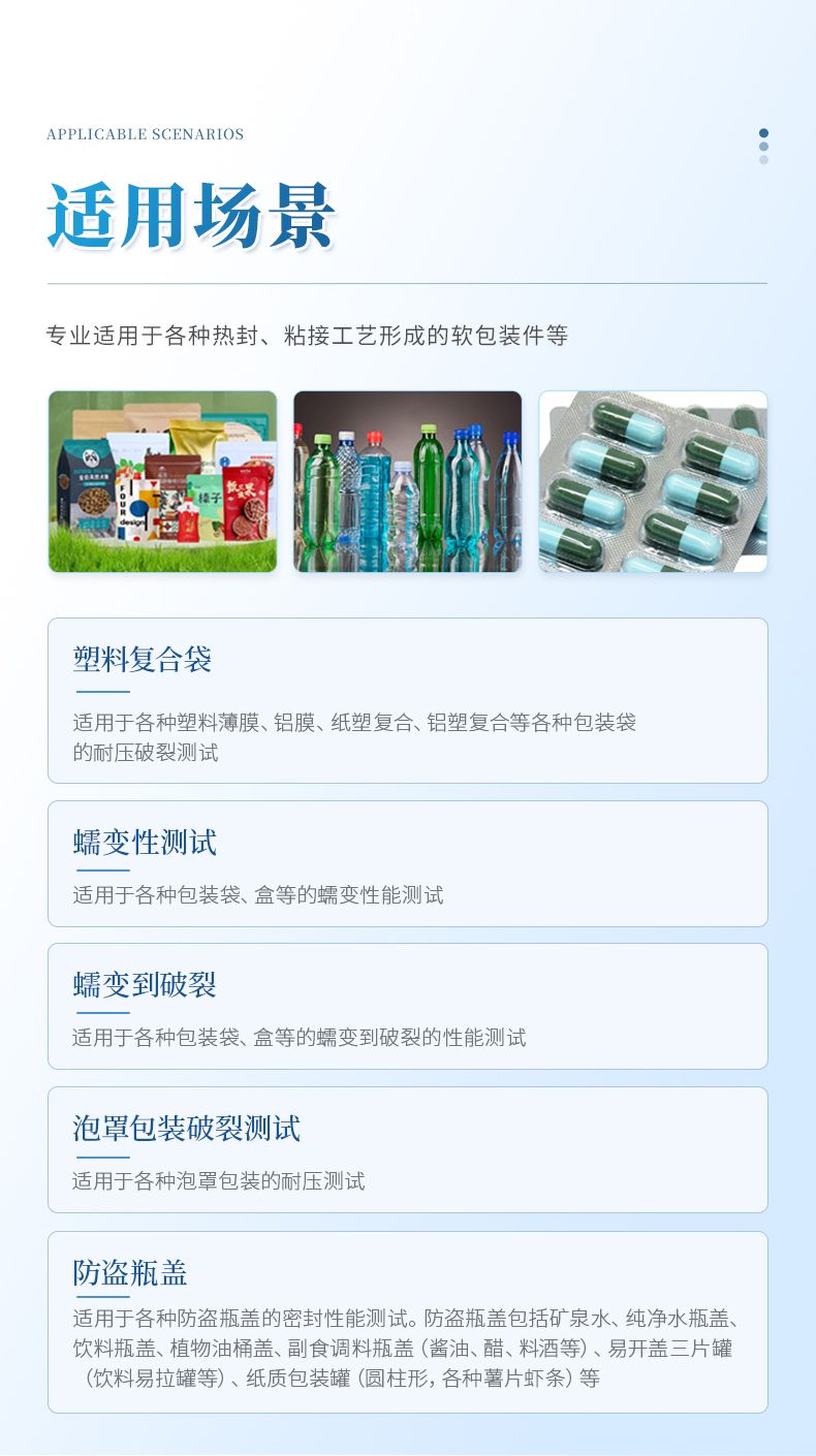 | 泡罩包裝破裂測試 | 適用于各種泡罩包裝的耐壓測試 |