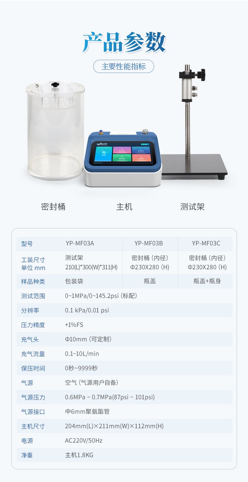 泄漏與密封強度測試儀,專業適用于各種熱封、粘接工藝形成的軟包裝件、無菌包裝件等各封邊的封口強度、熱封質量、以及整袋脹破壓力、密封泄漏性能的量化測定;對軟包裝袋所使用材料的抗壓強度、耐破強度等指標分析;各種塑料防盜瓶蓋密封性能、瓶蓋連接脫扣強度、材料的應力強度的量化測定;瓶體密封性、抗壓性、耐破性等評估分析。通過正壓法來進行測試,模擬實際使用環境下的密封強度、泄漏性能和耐壓極限,為各行業的包裝質量管控提供可靠的依據。