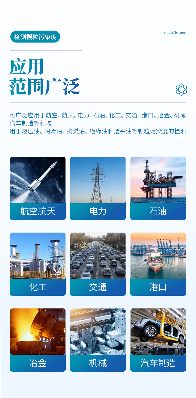 YP-YT20油液顆粒計數(shù)器依據(jù)GB/T18854-2002-(ISO11171-1999)等標(biāo)準(zhǔn)。采用光阻(遮光)法計數(shù)原理研制,完全符合相應(yīng)國軍標(biāo)、國家標(biāo)準(zhǔn)及國際標(biāo)準(zhǔn)??商峁┛焖?、準(zhǔn)確、可靠、可重復(fù)的檢測結(jié)果及完整的污染監(jiān)測分析報告,適用于液壓油、潤滑油、抗燃油、絕緣油和透平油等顆粒污染度的檢測??蓮V泛應(yīng)用于航空、航天、電力、石油、化工、交通、港口、冶金、機(jī)械、汽車制造等領(lǐng)域。