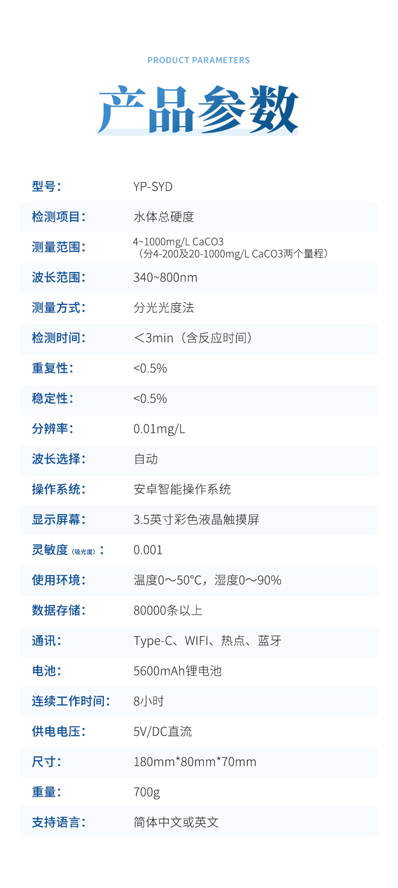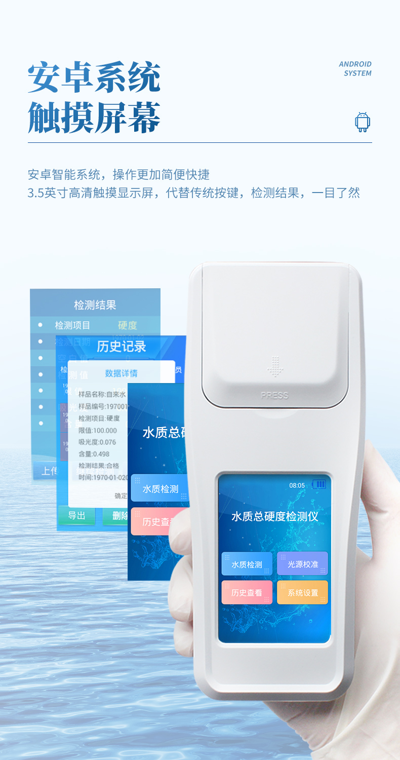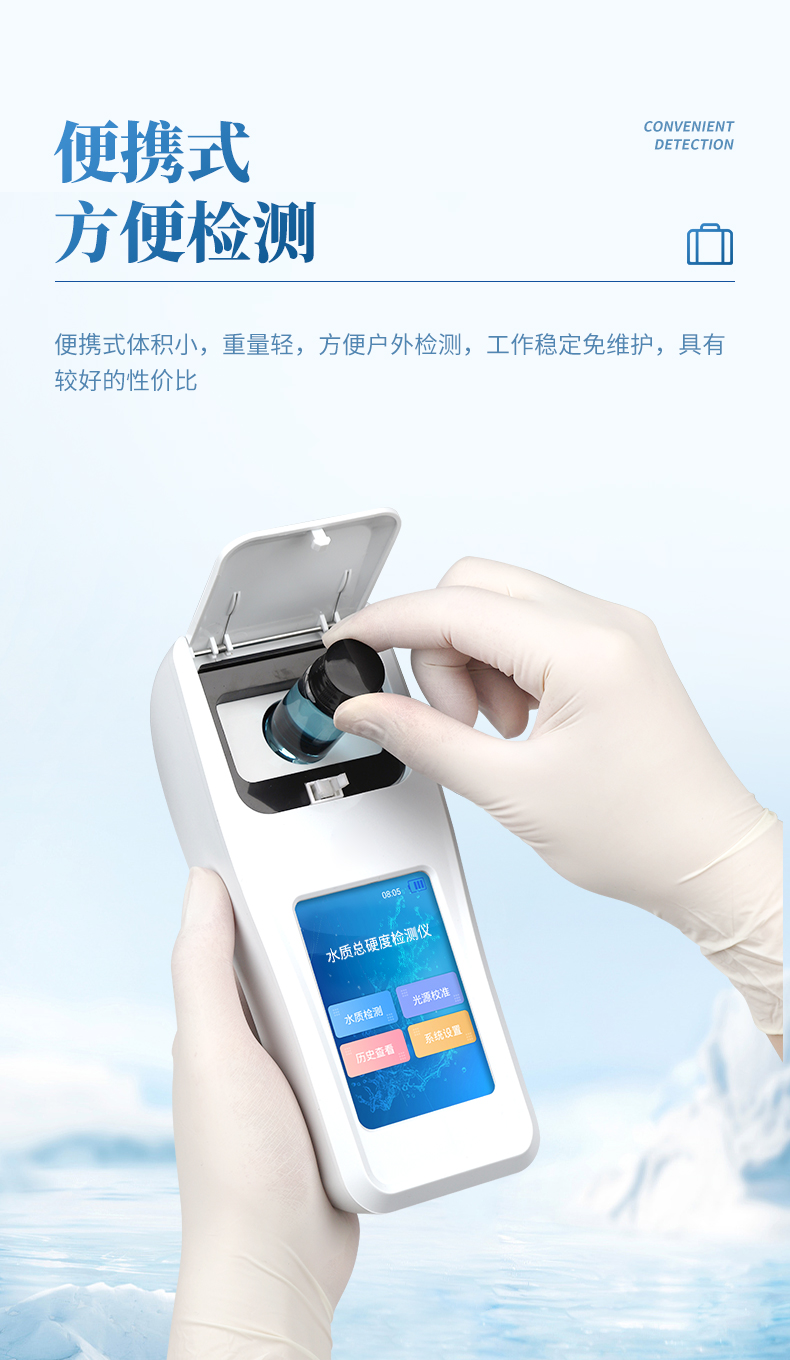 水質(zhì)總硬度檢測(cè)儀可簡(jiǎn)單快速測(cè)試水質(zhì)中總硬度濃度值。利用比色法原理配合總硬度檢測(cè)試劑快速準(zhǔn)確測(cè)試水中總硬度含量。