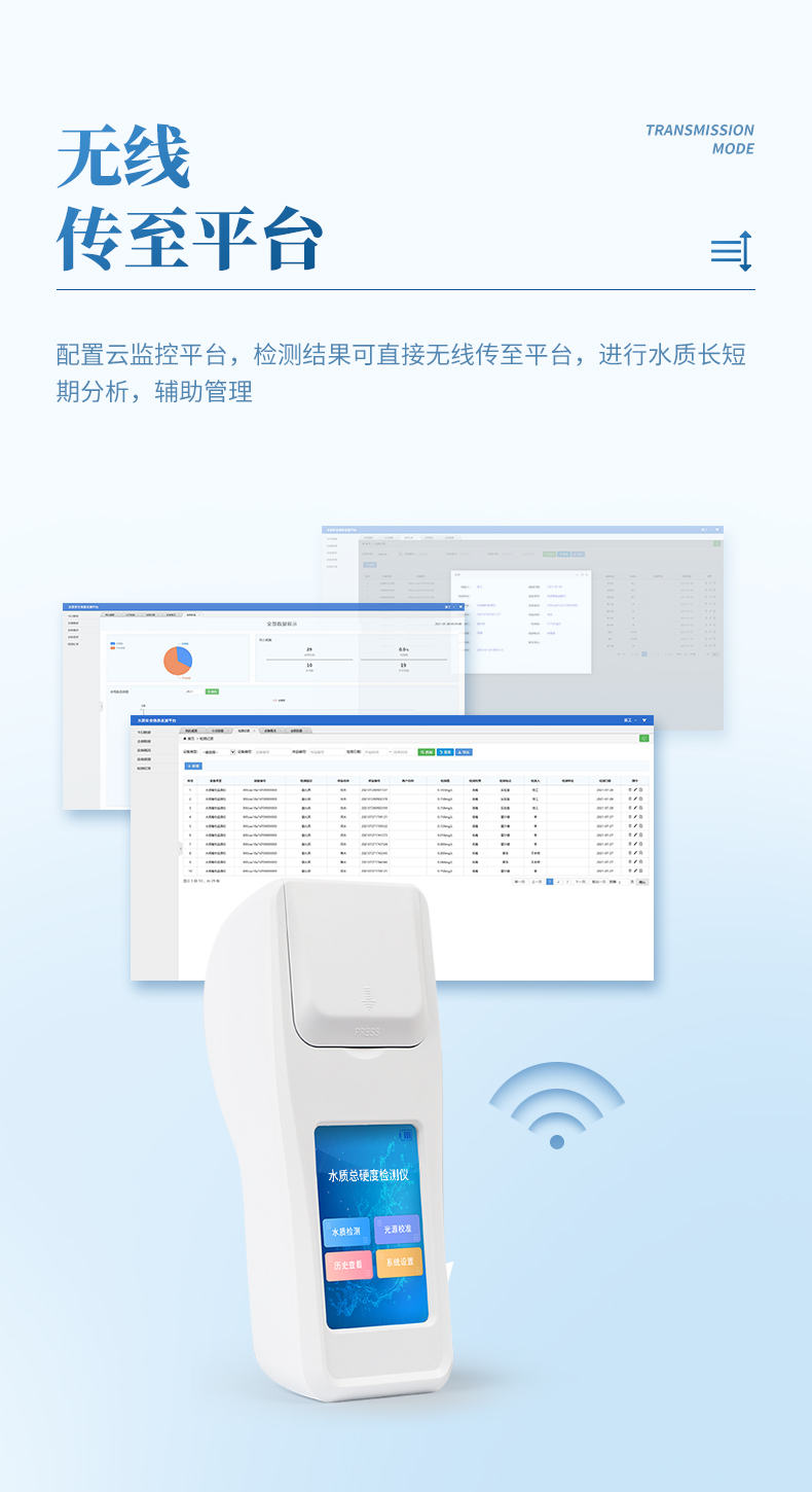 ②配置云監(jiān)控平臺(tái),檢測(cè)結(jié)果可直接無線傳至平臺(tái),進(jìn)行水質(zhì)長短期分析,輔助管理。
